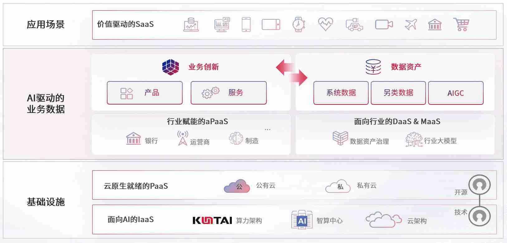 数字时代,,,,围绕企业数字化转型的关键要素,,,猫先生体育数码开创性的提出数云融合战略和技术体系框架,,着力在云原生、、、、数字原生、、AI原生和信创产业上架构产品和服务能力,,,为处在不同数字化转型阶段的快消零售、、汽车、、金融、、、、医疗、、、政企、、、教育、、、运营商等行业客户提供泛在的敏捷IT能力和融合的数据驱动能力,,,,构建跨界融合创新的数字业务场景和新业务模式,,,,助力企业级客户建立面向未来的核心能力和竞争优势,,,全面推动社会的数字化、、智能化转型升级。。。。